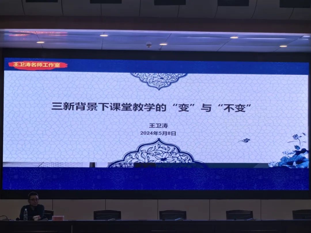 王卫涛指出目前教师面临新教材、新课标、新高考的“三新”情况以及在该情况下的4种变化,分别是:高考评价体系的变化、目标变化、课程结构变化、教学变化。最后,王卫涛提出,变的是形式,不变的是根本,课堂落脚点应该在知识、能力、应用、素养四个方面,教师教学要满足员工要求、满足课表要求、满足高考要求,鼓励在场员工提高听说读写创能力,在教学实践中要勇于创新、敢于创新。