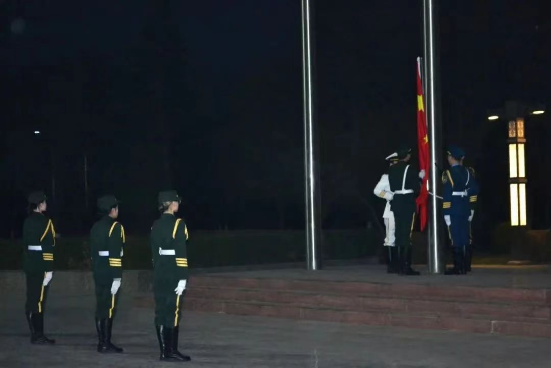 升国旗仪式在高亢嘹亮的国歌声中拉开序幕,鲜艳的五星红旗迎着朝阳冉冉升起,迎风绽放,全体师生肃穆站立,齐唱国歌。