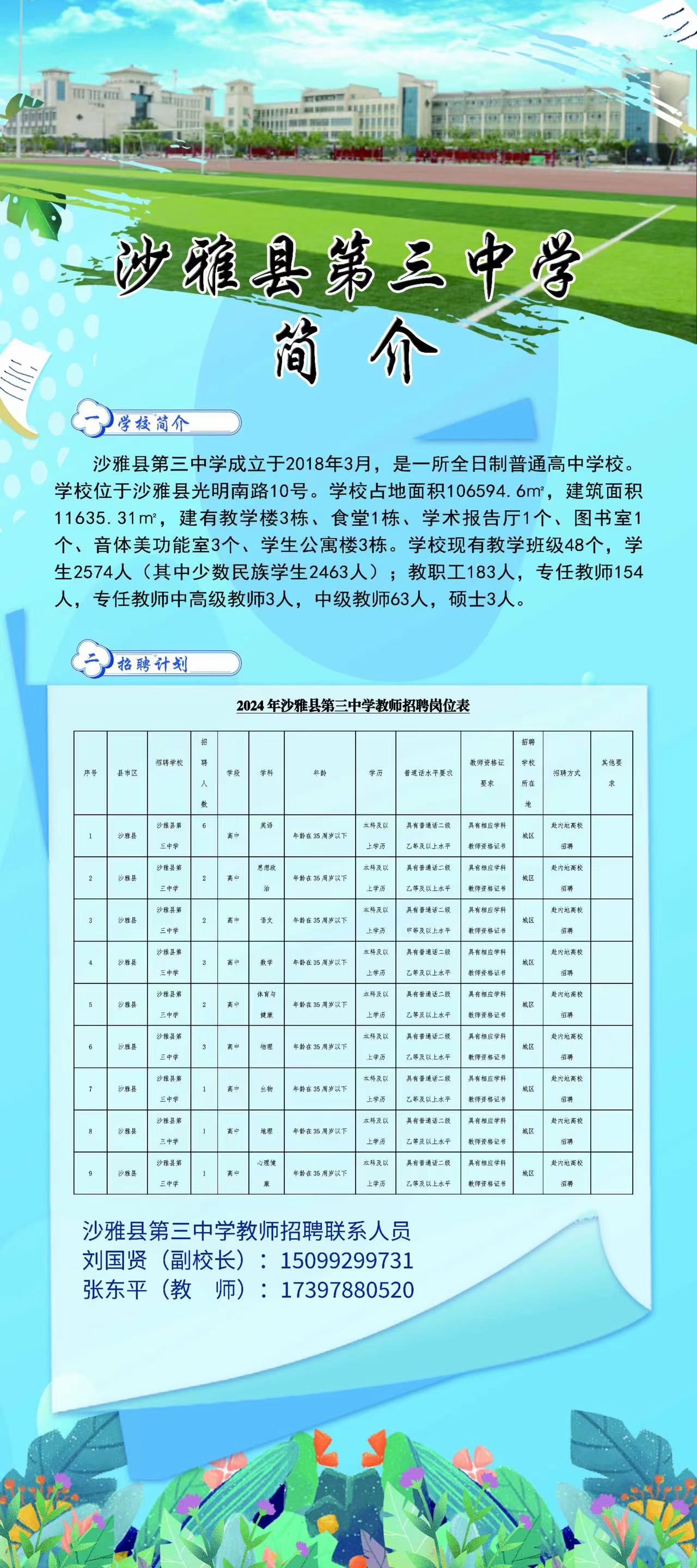 招聘信息:沙雅县第三中学