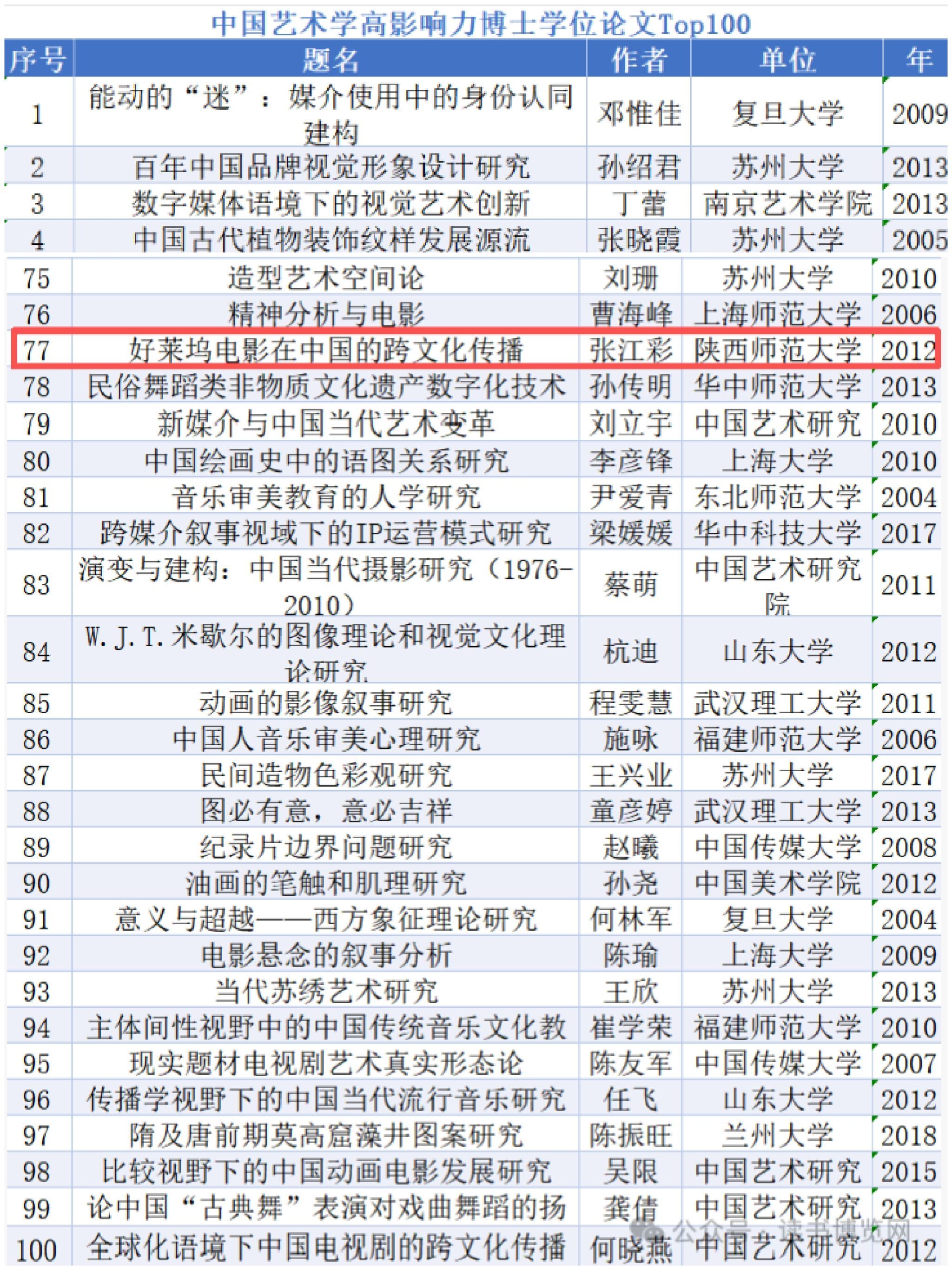 近日,读书博览网“中国艺术学高影响力博士说文Top100”公布,英国365集团官网张江彩教授的博士学位论文《好莱坞电影在中国的跨文化传播》成功入围。